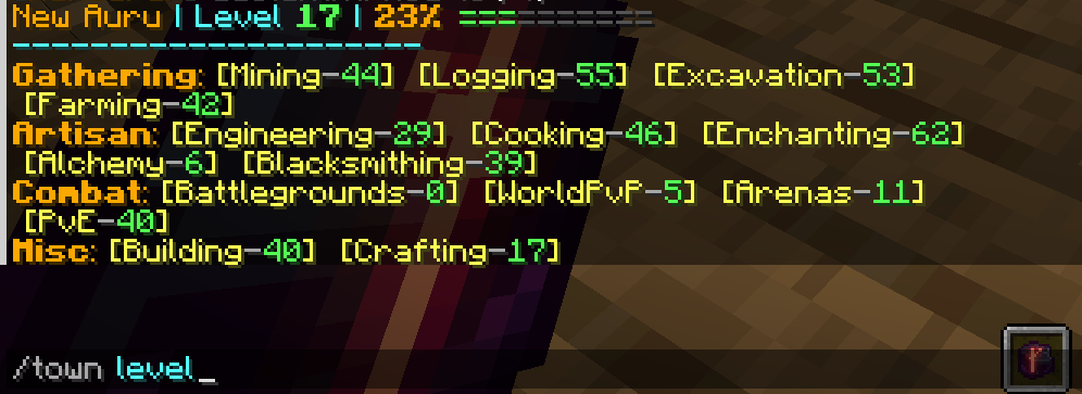 There are currently 15 different masteries you can level. Each can reach a maximum level of 100 and are split into 4 categories, Gathering, Artisan, Combat, and Miscellaneous. To view your towns mastery levels in game simply type /town level. As well as increasing your towns total level each mastery also unlocks a special industry buildings for your town. To unlock the industries you must reach level 20 in any gathering mastery and level 40 in any artisan mastery. To find out more about industries click here.